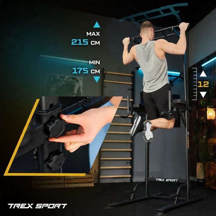 - 12-ступінчасте регулювання висоти: Дозволяє налаштувати висоту перекладини в діапазоні від 175 см до 215 см, адаптуючи тренажер під зріст будь-якого користувача та тип вправ.
