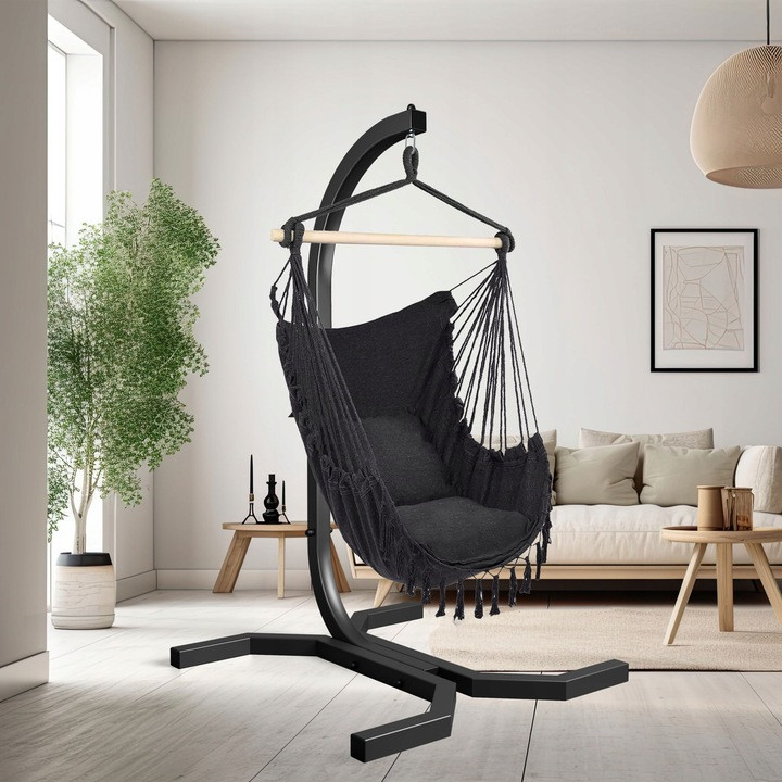 Цей підвісний стілець перетворить кожен момент відпочинку на екзотичну пригоду. Створений для тих, хто мріє відчути бразильську свободу, не виходячи з власного саду, його елегантний чорний каркас втілює сучасний дизайн, гармонійно вписуючись у будь-яке оточення. Дозвольте кожному дню починатися та закінчуватися в цьому чарівному кріслі, що подарує вам незабутні хвилини релаксу.